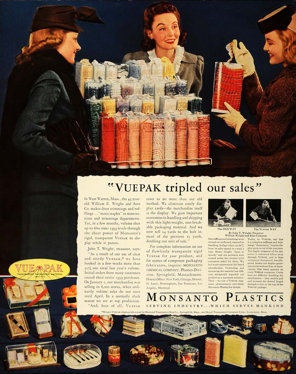This is an original 1940 color print ad for Monsanto's Vuepak, a transparent packaging material from the Monsanto Chemical Company.
