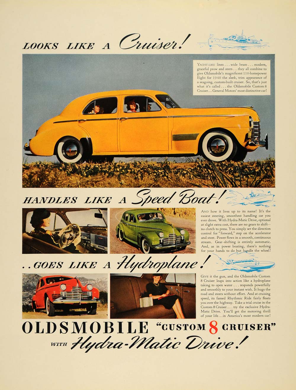 This is an original 1940 color print ad for the Oldsmobile Custom 8 Cruiser, featured in banana yellow, lime green, and cherry red, with Hydra-Matic Drive.
