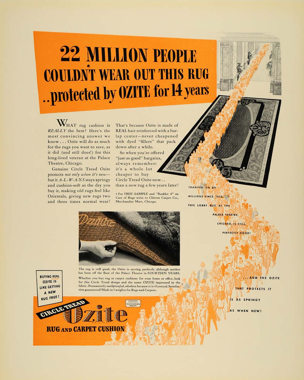 This is an original 1940 color print ad for the Ozite Rug and Carpet Cushion from Clinton Carpet Company located in Chicago.