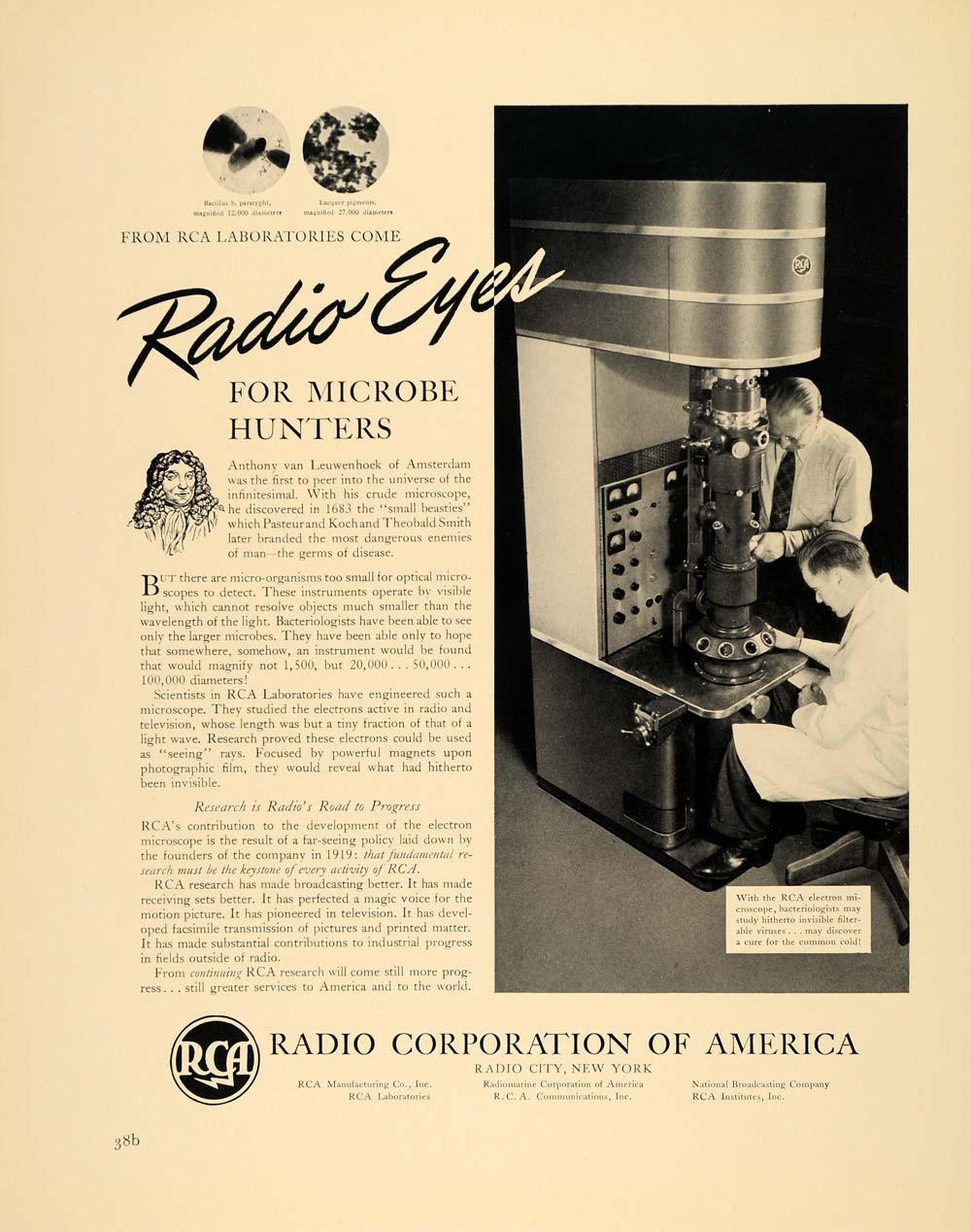 Keywords specific to this image: Anthony Van Leuwenhoek, Amsterdam, Pasteur, Koch, Theobald Smith, Germs, Disease, Bacteria, RCA Vintage Advertising
