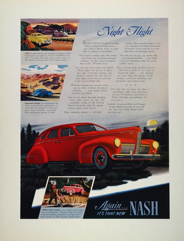 This is an original 1940 color print ad for Nash Arrow-Flight automobiles, with convertible bed and automatic "Weather Eye."