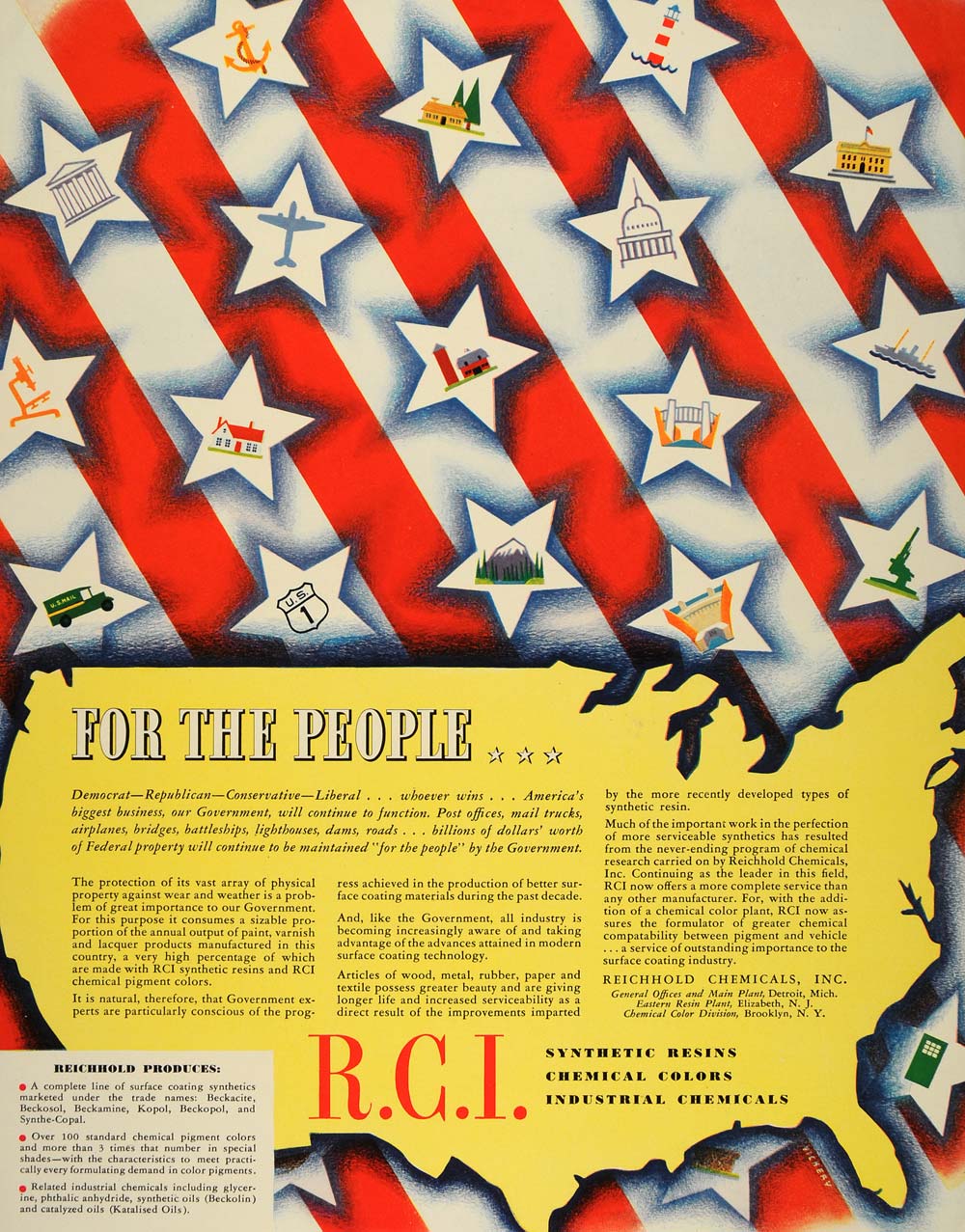 This is an original 1940 color print ad for Reichhold Synthetic Resins from Reichhold Chemicals, Inc.