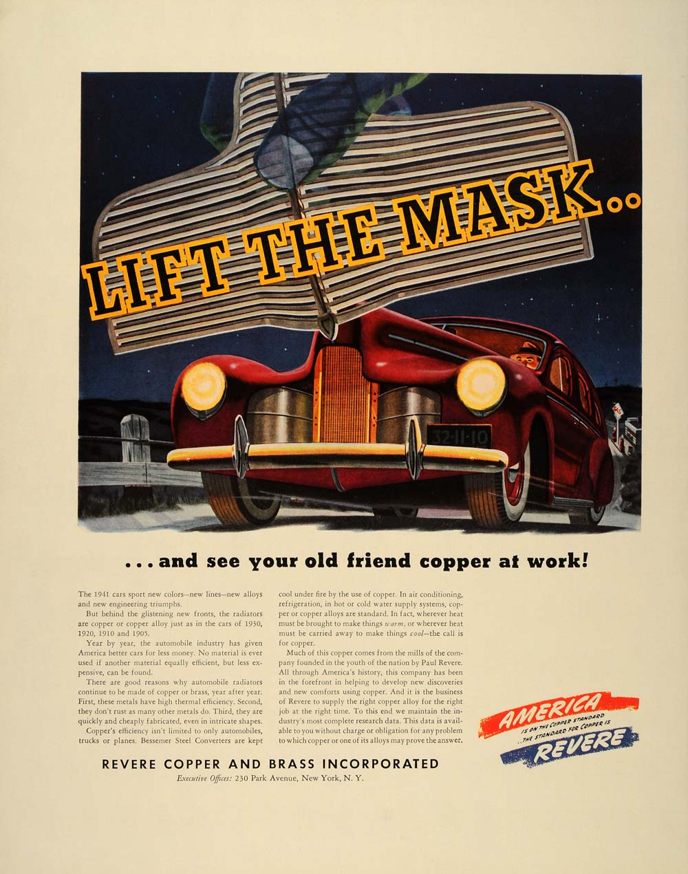 This is an original 1940 color print ad for Revere Copper and Brass Inc., whose copper and copper alloys are used in the manufacture of car radiators.