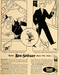 This is an original 1940 black and white print ad for Rex-Seltzer by Rexall Drugs. The ad writes, "Rex-Seltzer, taken at the first sign of a cold, often acts as a preventive. Its alkalinizing analgesique action is also recommended for neuralgia and muscular aches."