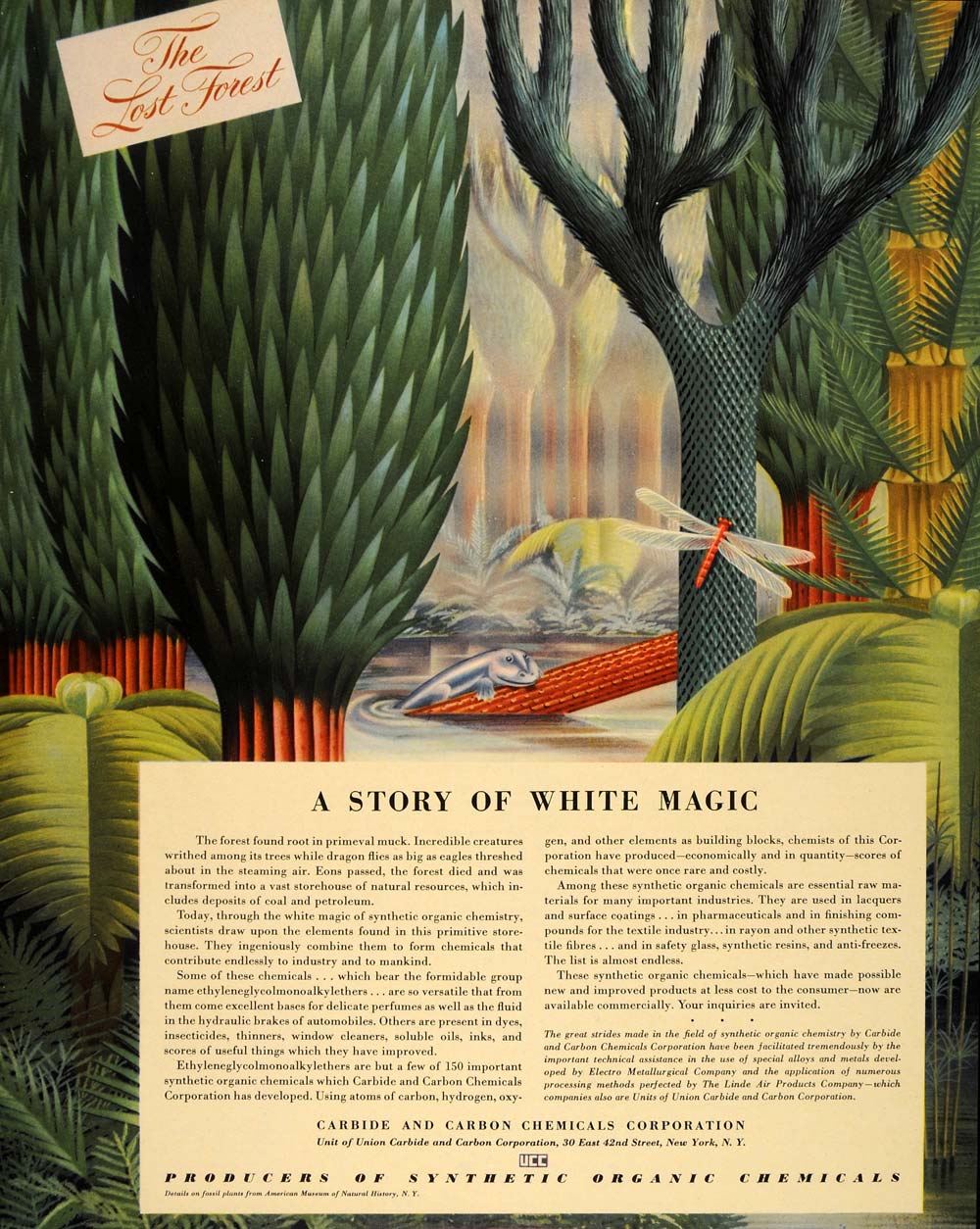 This is an original 1940 color print ad for Synthetic Organic Chemicals from the Carbide and Carbon Chemicals Corporation, a unit of Union Carbide and Carbon Corporation, 30 East 42nd Street, NYC.