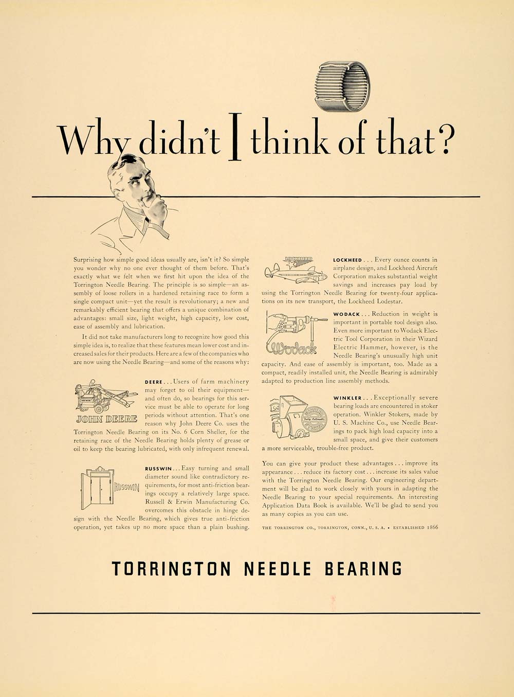 Keywords specific to this image: John Deere, Russwin, Lockheed, Wodack, Winkler, machine, machinery, mechanical, hardware, Corn Sheller, Russell & Erwin Manufacturing, U. S. Machine Company, Stoker, Electric Tool Corporation, Wizard Electric Hammer, Aircraft Corporation, Lodestar, lubrication, metal Vintage Advertising