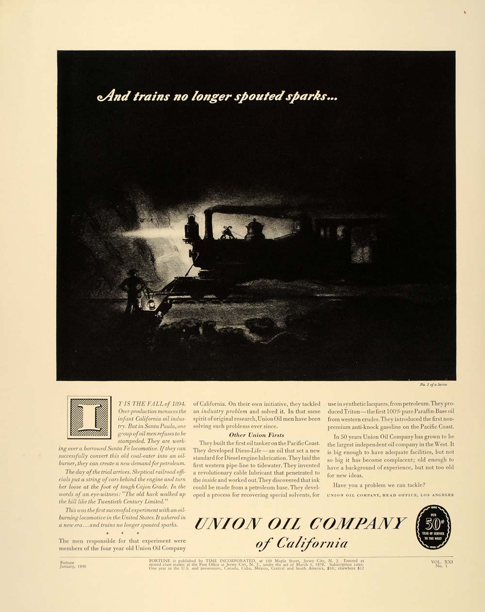 This is an original 1940 black and white print ad for the Union Oil Company of California with a nice illustration of a coal-burning Santa Fe locomotive turned into an oil-burning locomotive.