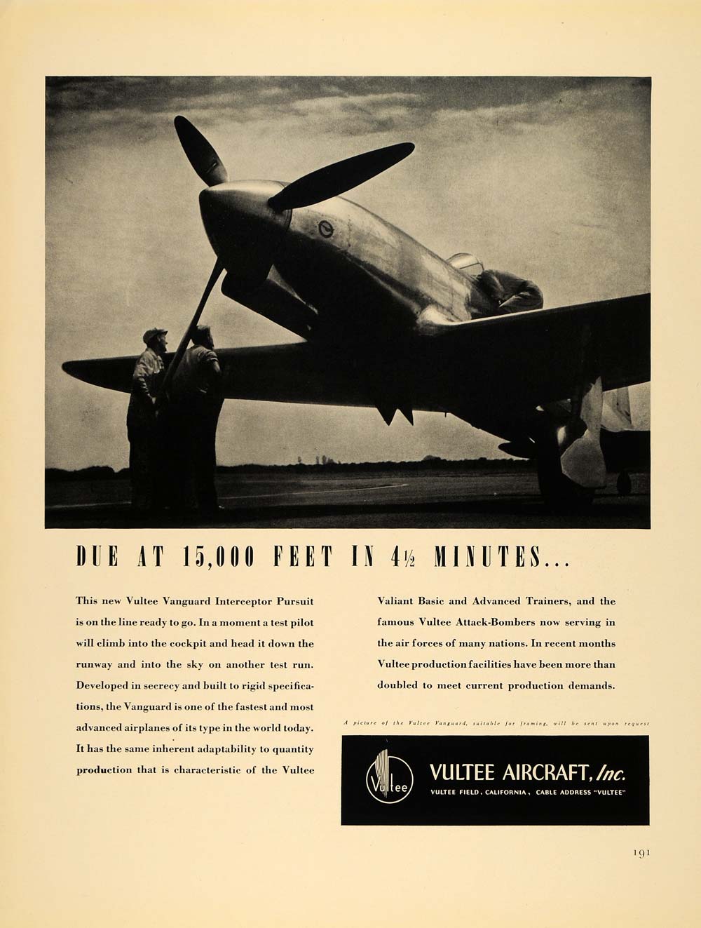 This is an original 1940 black and white print ad promoting the Vultee Vanguard Interceptor Pursuit plane from Vultee Aircraft Incorporation located in Vultee Field, California.