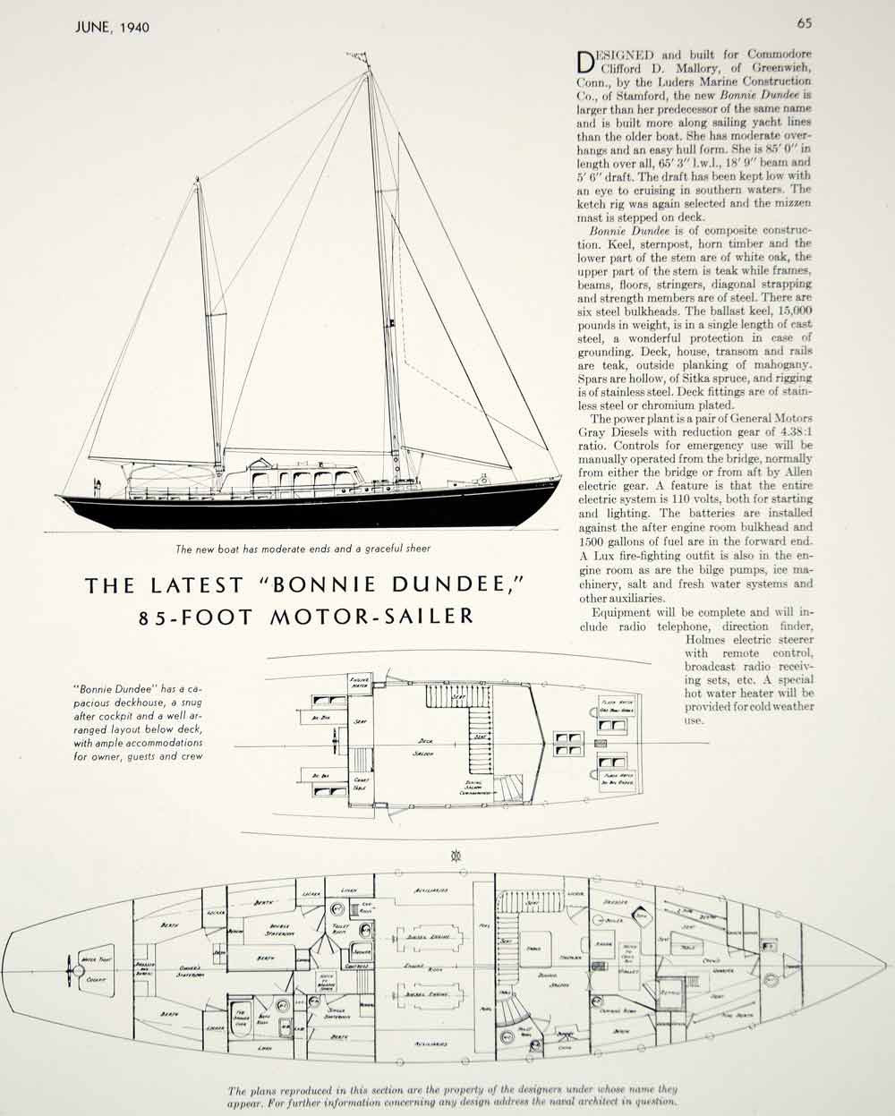 This is an original 1940 one-page black and white print article describing the "Bonnie Dundee," a new 85-foot motor-sailer, designed and built by the Luders Marine Construction Co. of Stamford for Commodore Clifford D. Mallory of Greenwich, CT. The article includes a profile diagram and cabin plans.