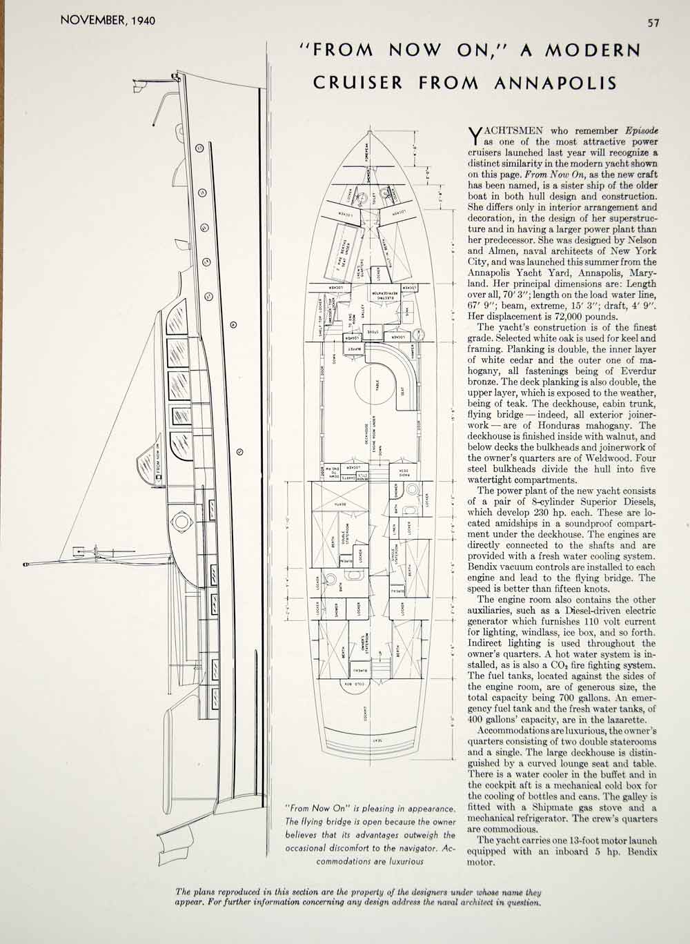 This is an original 1940 one-page black and white print article describing the "From Now On," a new 70-foot, 3-inch auxiliary cruising yacht, designed by Nelson and Almen, naval architects of NYC and built at the Annapolis Yacht Yard. The article includes a profile diagram and cabin plan.