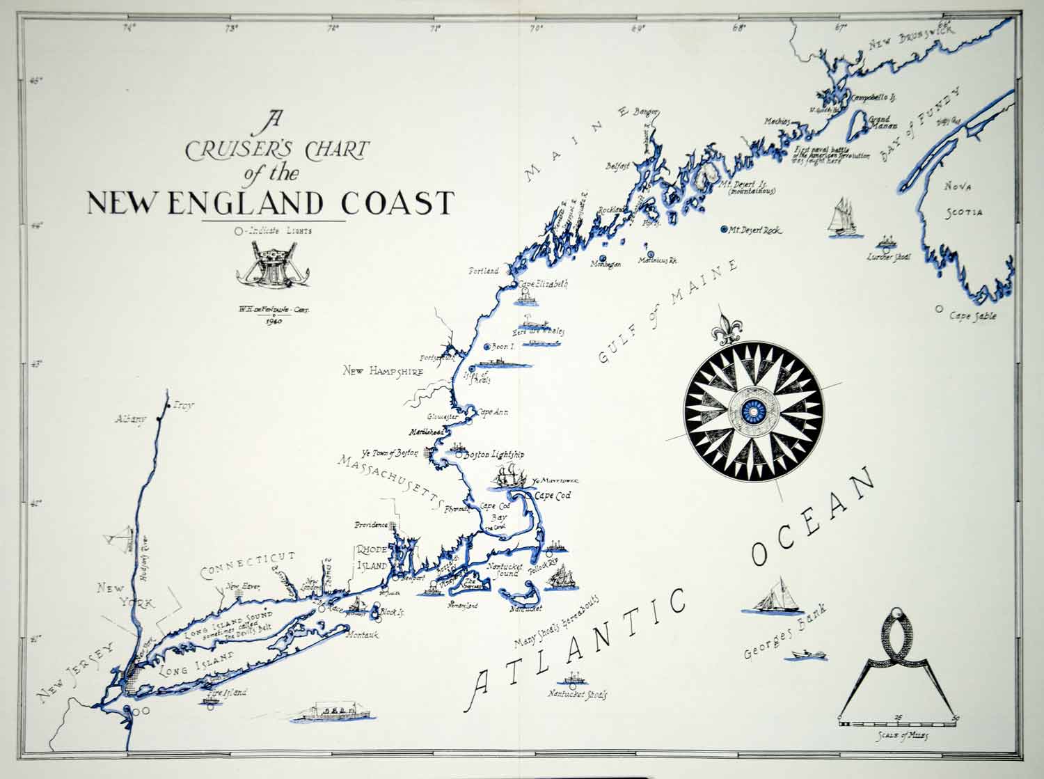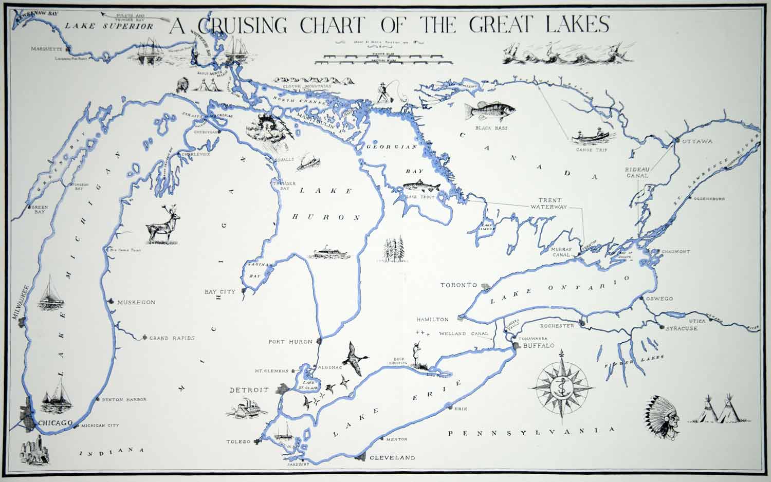 This is an original 1940 two-color, double-sided lithograph map of the Great Lakes drawn by Dennis Puleston. On the reverse is "A Cruiser's Chart of the New England Coast" drawn by W. H. DeFontaine. Please see both images.