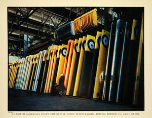 This is an original 1940 color print of aircraft wings stacked. The caption writes, "At North American's plant the battle wings stand racked: British, French, U. S. Army, Brazil." Photography by Holland.