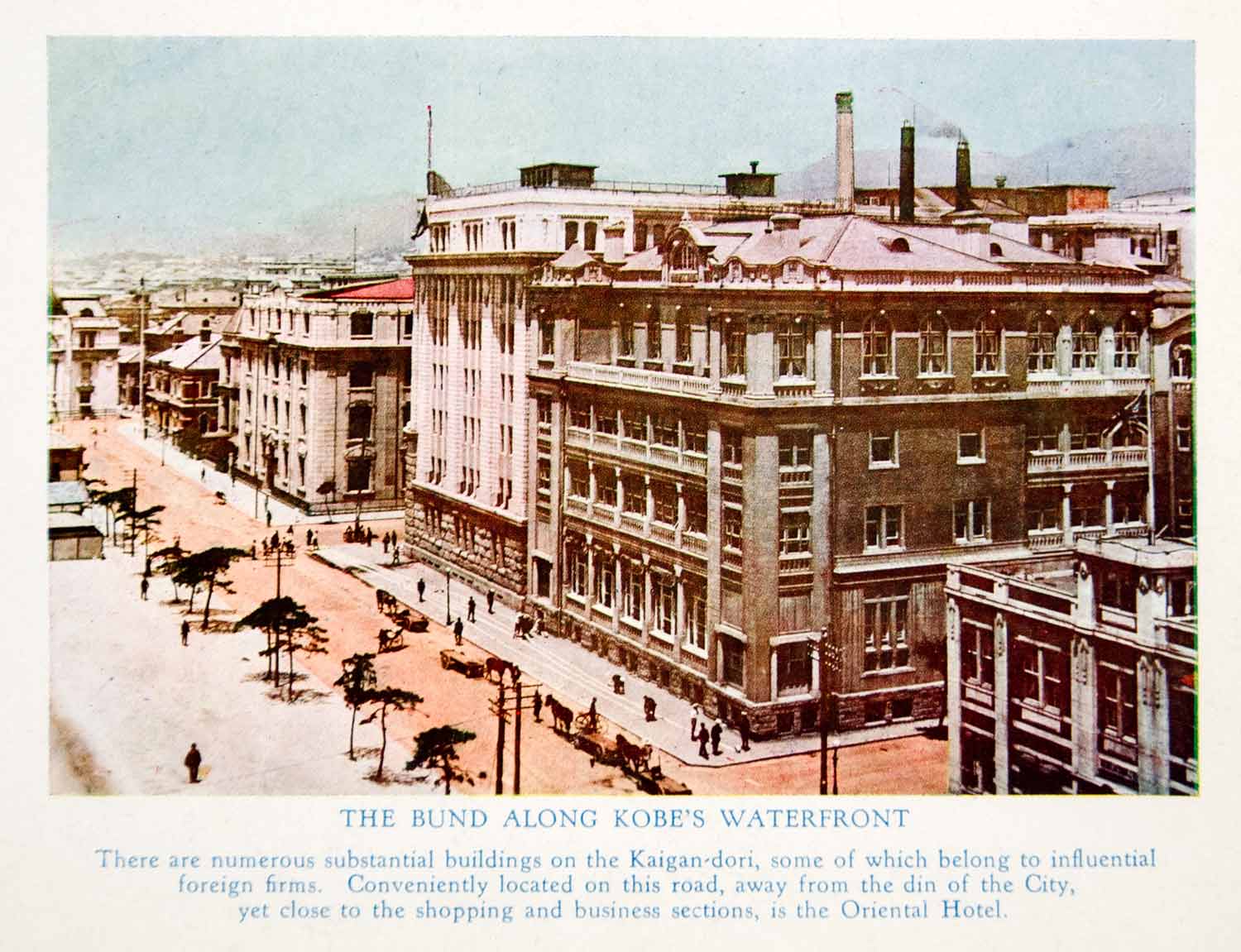 This is an original 1940 color print of the Bund along the waterfront of Kobe, Japan.