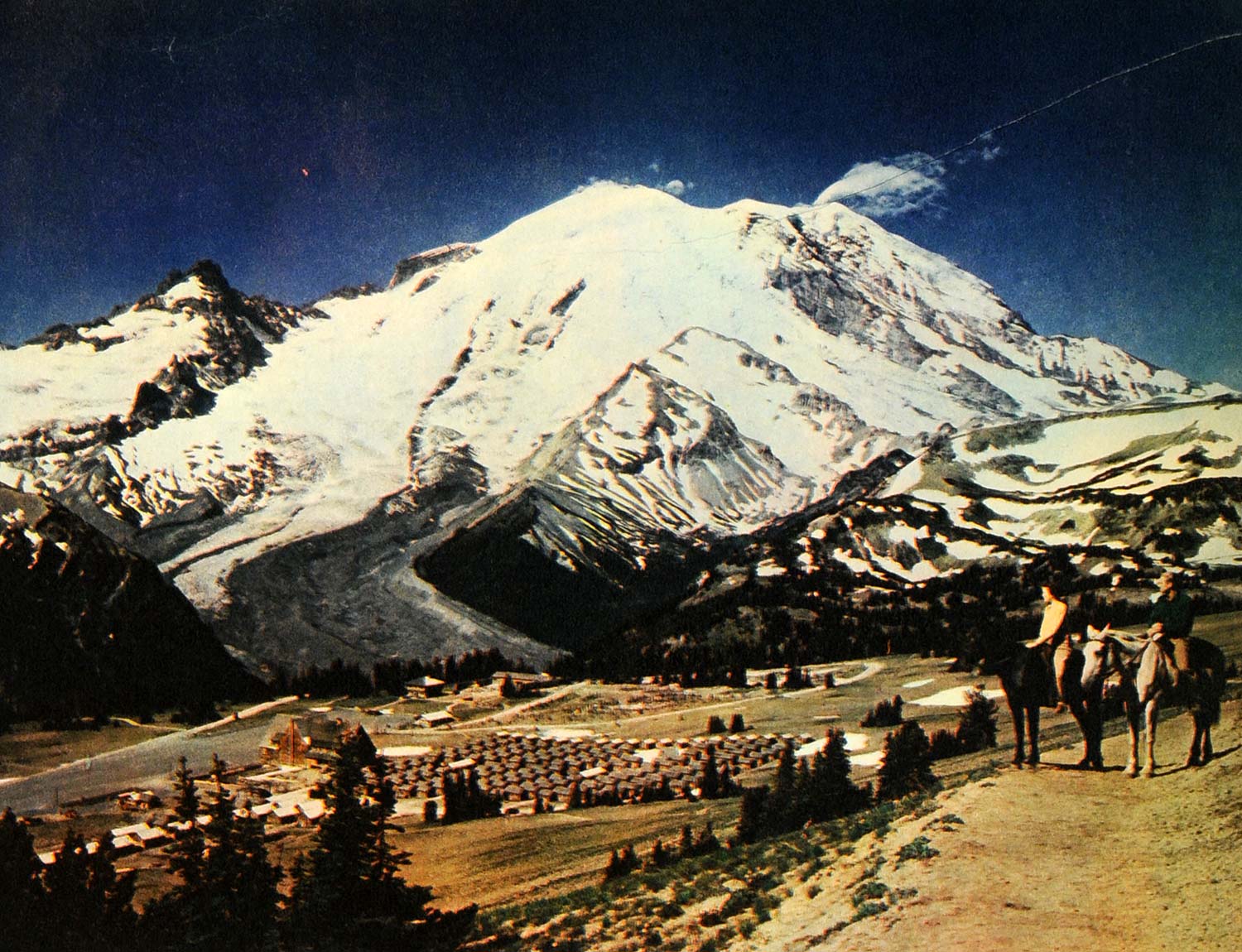 Keywords specific to this image: Mount Tacoma, Mountain, Volanic, Stratovolcano, Horse, Horseback, Village