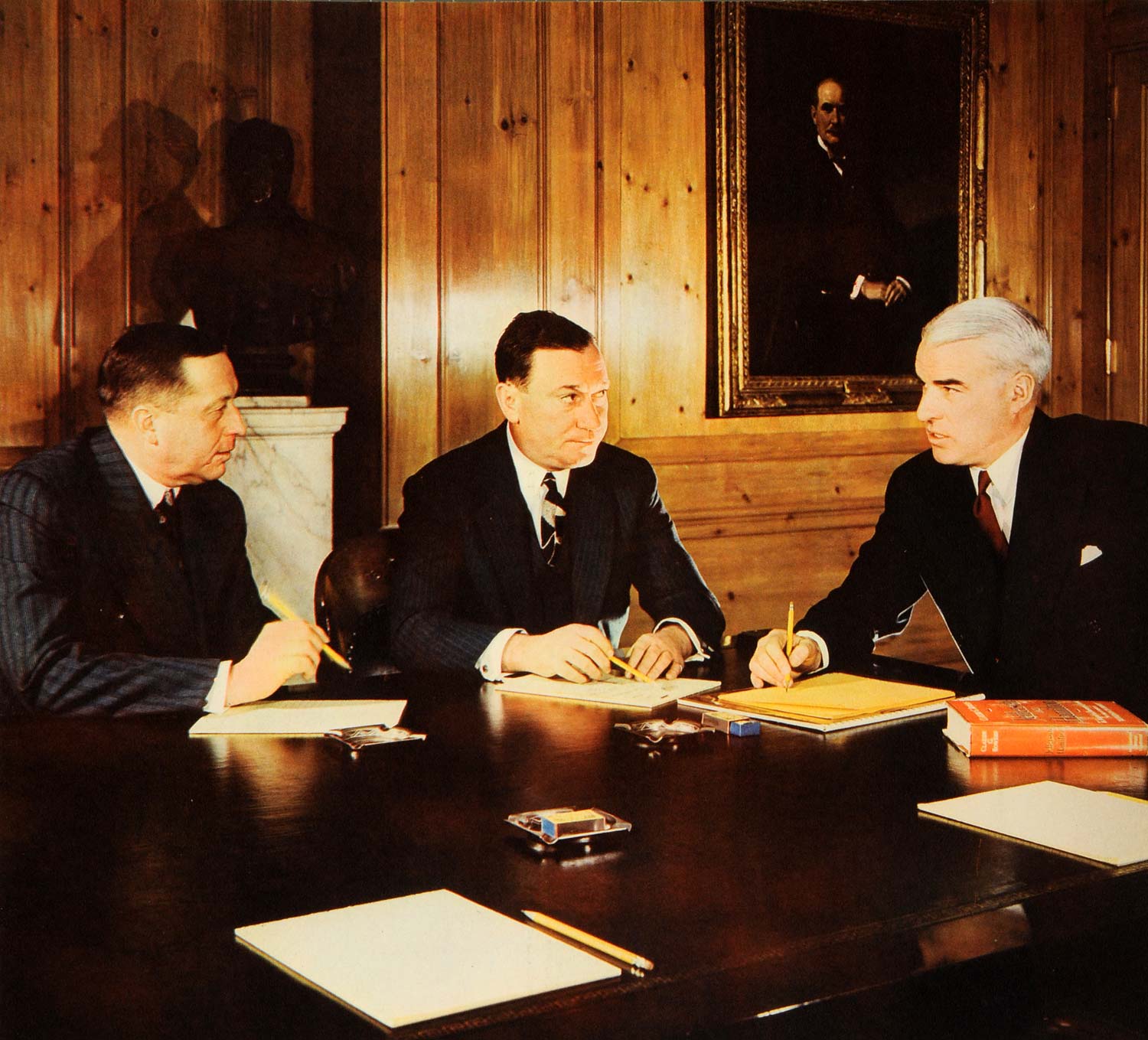 This is an original 1940 color print of Enders M. Voorhees, Ben Fairless and Edward R. Stettinius Jr. at a finance committee meeting at the United States Steel Corporation. Edward Stettinius Jr. later became the Secretary of State for the United States from 1944 to 1945. Photography by Robert Yarnall Richie.