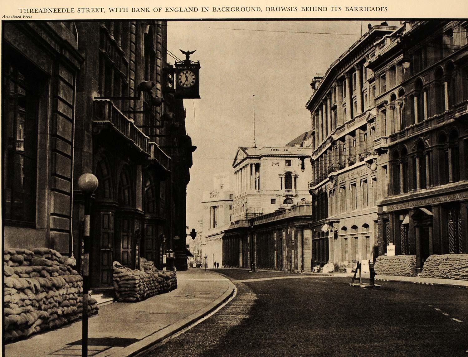 This is an original 1940 halftone print of Threadneedle Street in London as it appeared with sandbag barricade protection during World War II. (Please note that there is printing on the reverse.)