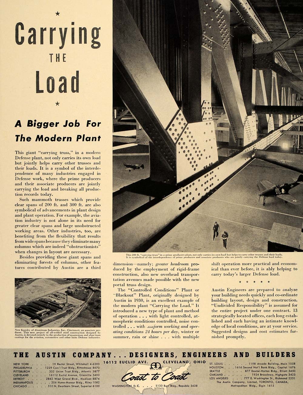 This is an original 1941 black and white print ad for The Austin Company, Designers, Engineers and Builders, 16112 Euclid Ave., Cleveland, Ohio. The ad includes an illustration of a 200 foot "carrying truss" in a prime producers defense plant.