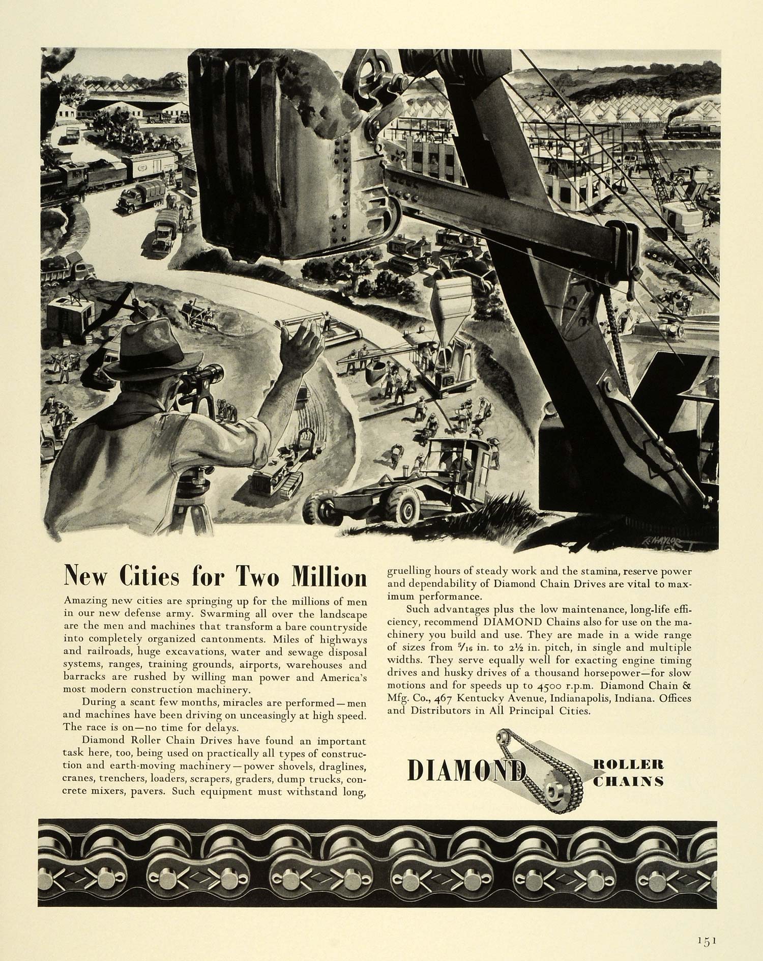 This is an original 1941 World War II black and white print ad for Diamond Roller Chain Drives, a product by the Diamond Chain and Manufacturing Company, located at 467 Kentucky Avenue in Indianapolis, Indiana. This company is doing its part to aid in the war production efforts by manufacturing a surplus of their supplies for utilization in the construction of army camps. This ad features artwork by R. Haylor.