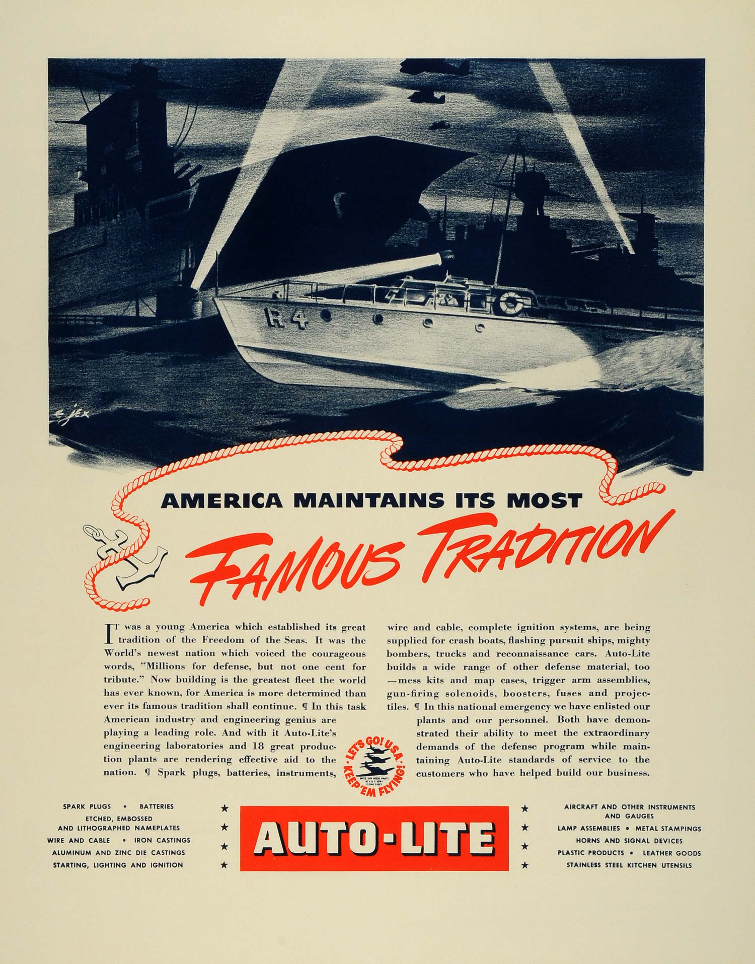 This is an original 1941 World War II two-color print ad for Auto Lite, who are doing their part to aid in the war production efforts by manufacturing a surplus of their supplies for defense needs. This ad features artwork by Garnet W. Jex.