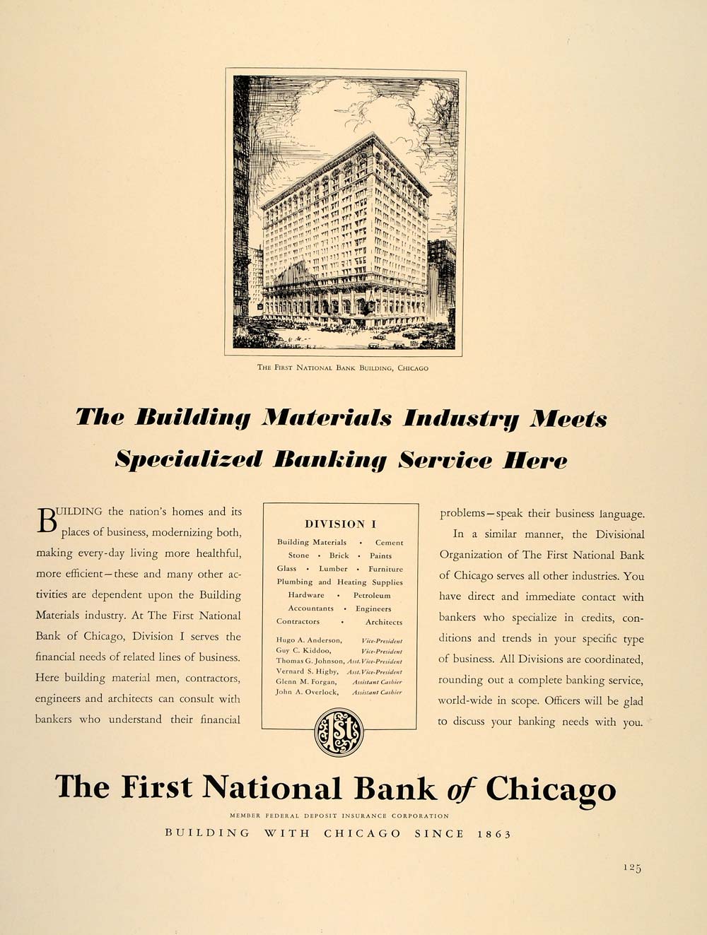 This is an original 1941 black and white print ad for the Division I department of The First National Bank of Chicago.
