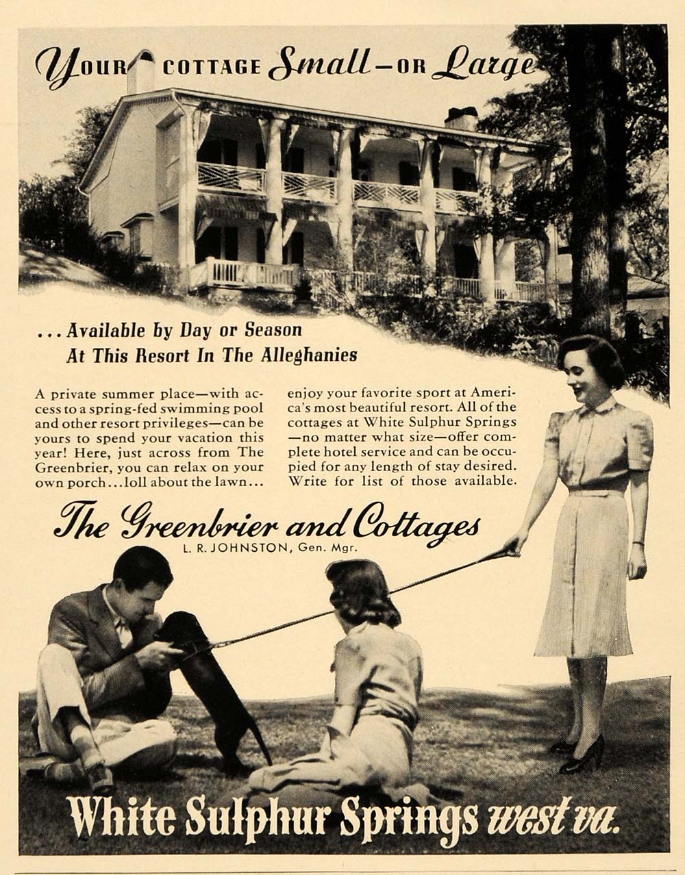 This is an original 1941 black and white print ad for The Greenbrier Hotel and Cottages at White Sulphur Springs in West Virginia.