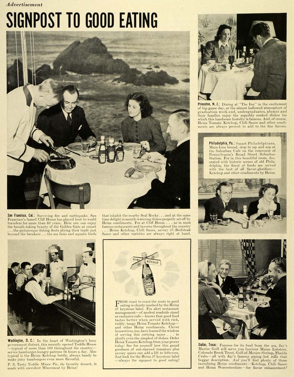 This is an original 1941 black and white print ad for Heinz Tomato Ketchup and other condiment varieties. This particular ad features restaurants which utilize the Heinz products, including Jay's Marine Grill in Dallas, Texas, the Suburban Cafe on the concourse of Pennsylvania's Broad Street Suburban Station in Philadelphia, The Inn of Princeton, New Jersey, the Cliff House of San Francisco, California and the Toddle House in Washington, D. C.