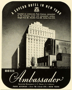 This is an original 1941 black and white print ad for the Hotel Ambassador, located on Park Avenue in Park Avenue in New York, under J. C. Thorne and J. J. Atkinson management.