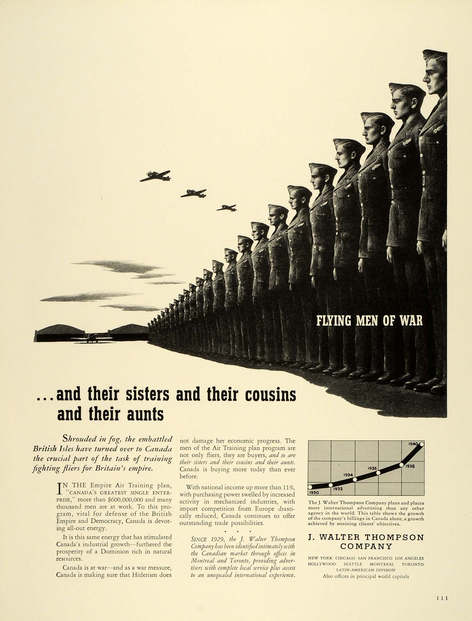 This is an original 1941 World War II black and white print ad for the J. Walter Thompson Company. This ad features the Empire Air Training Scheme, also known as the British Commonwealth Air Training Plan, which was responsible for training nearly half of the pilots, air gunners, wireless operators, aviation engineers, navigators and bomb aimers who served with the Royal Canadian Air Force, the Royal New Zealand Air Force, the Royal Australian Air Force and the Royal Air Force. This enormous joint military aviation training program was implemented by the United Kingdom, Canada, New Zealand and Australia. It remains to be the single largest aircrew training program in history.