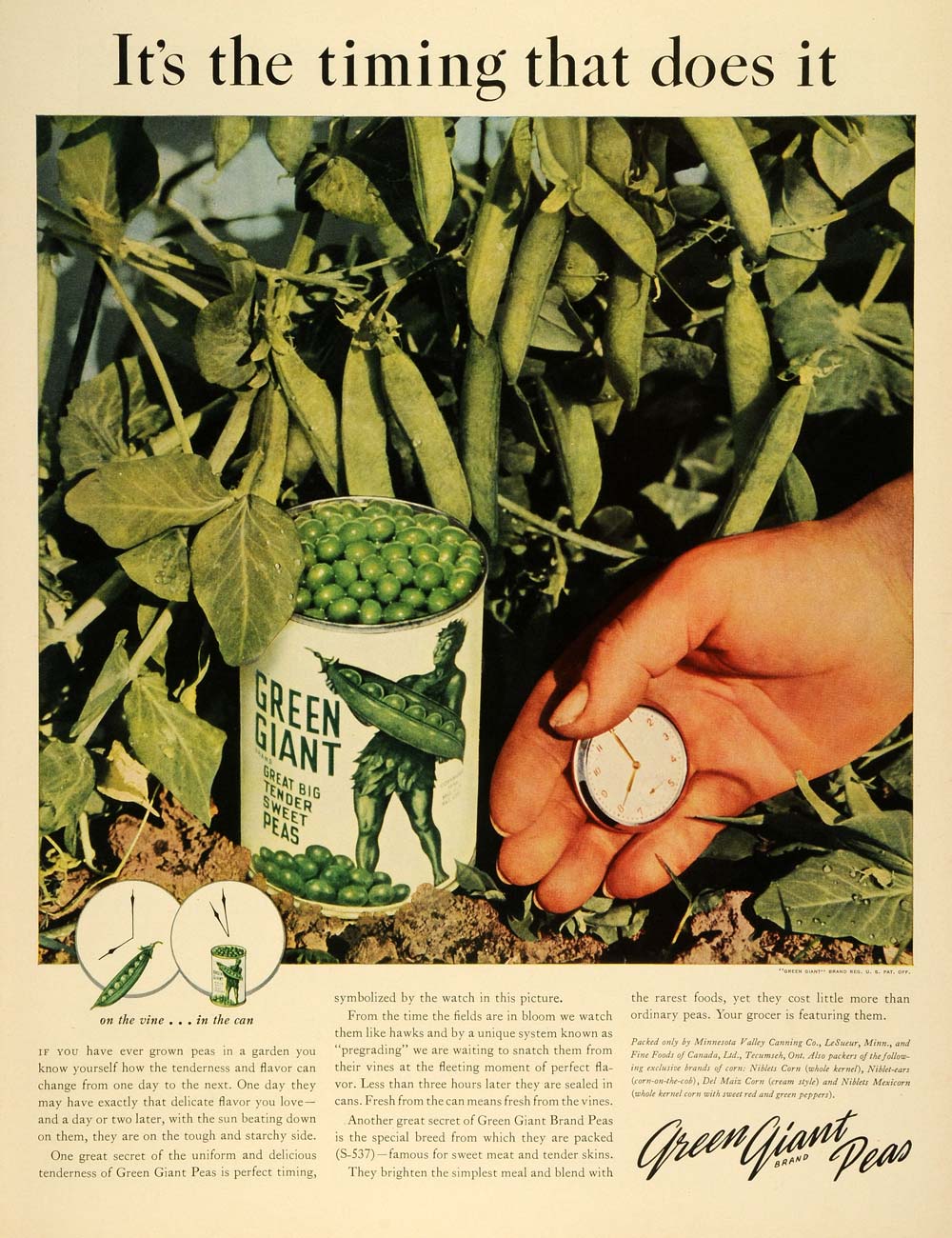 This is an original 1941 color print ad for the Green Giant Peas from Minnesota Valley Canning Company.