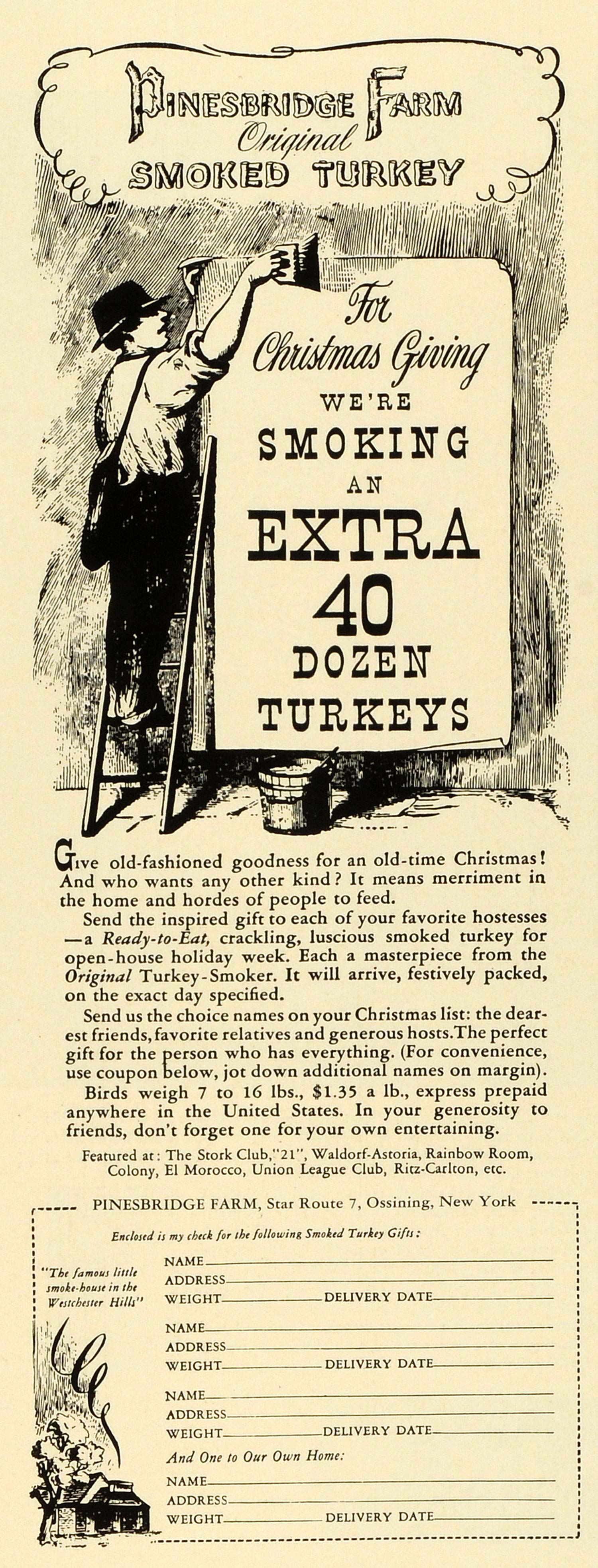 This is an original 1941 black and white print ad for Pinesbridge Farm Smoke Turkey in Ossining, New York.