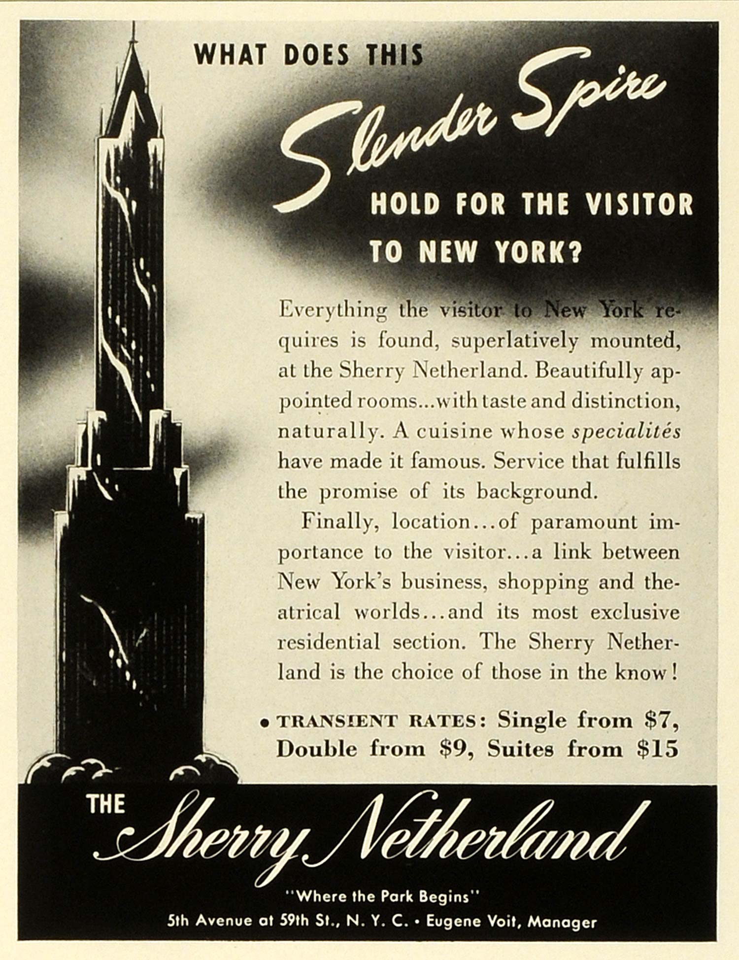 This is an original 1941 black and white print ad for The Sherry Netherland in New York City, under Eugene Voit management.