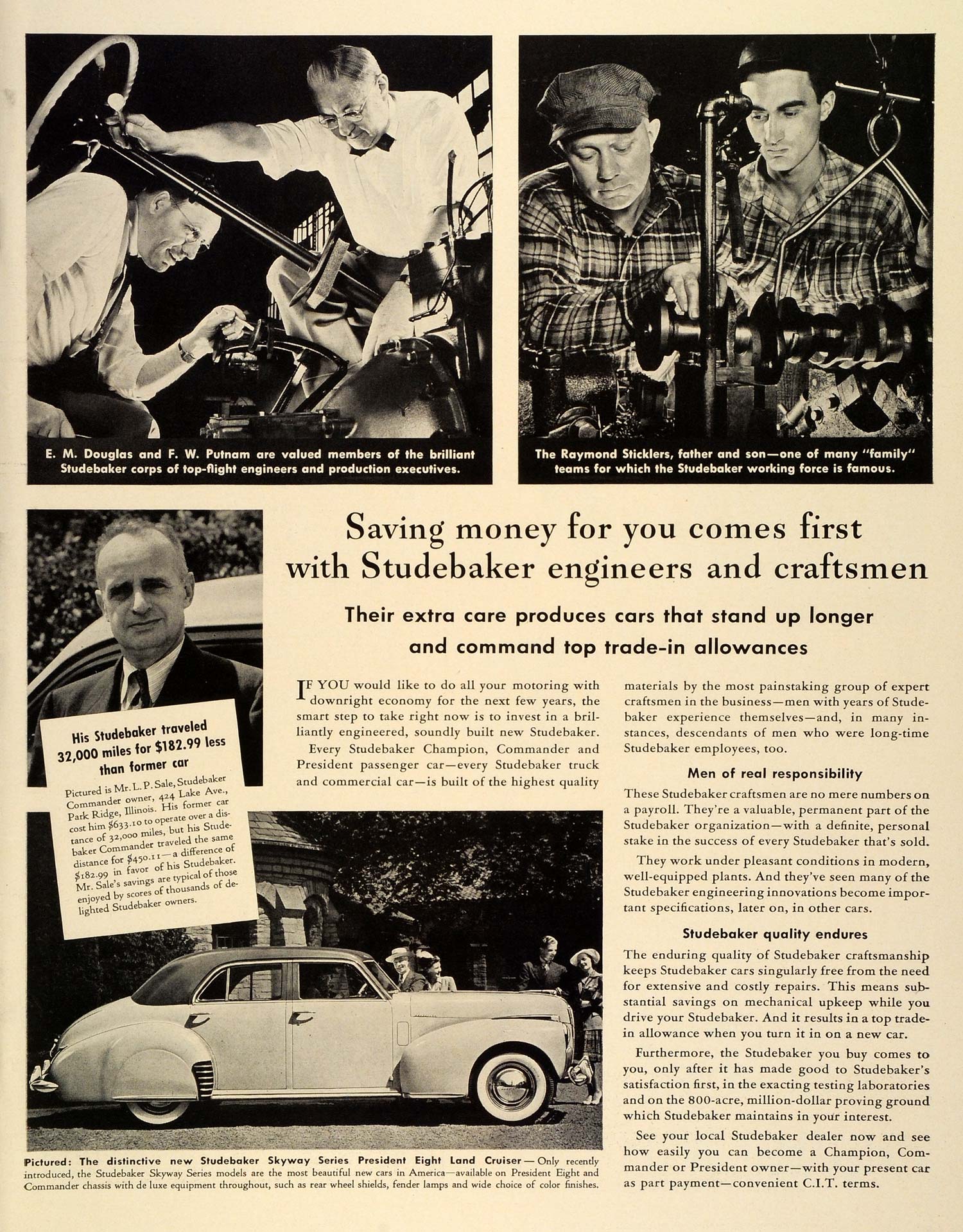This is an original 1941 black and white World War II Era print ad for Studebaker automobiles. This ad features The Raymond Sticklers, E. M. Douglas, F. W. Putnam, Mr. L. P. Sale and the new Studebaker Skyway Series President Eight Land Cruiser with Commander Chassis.