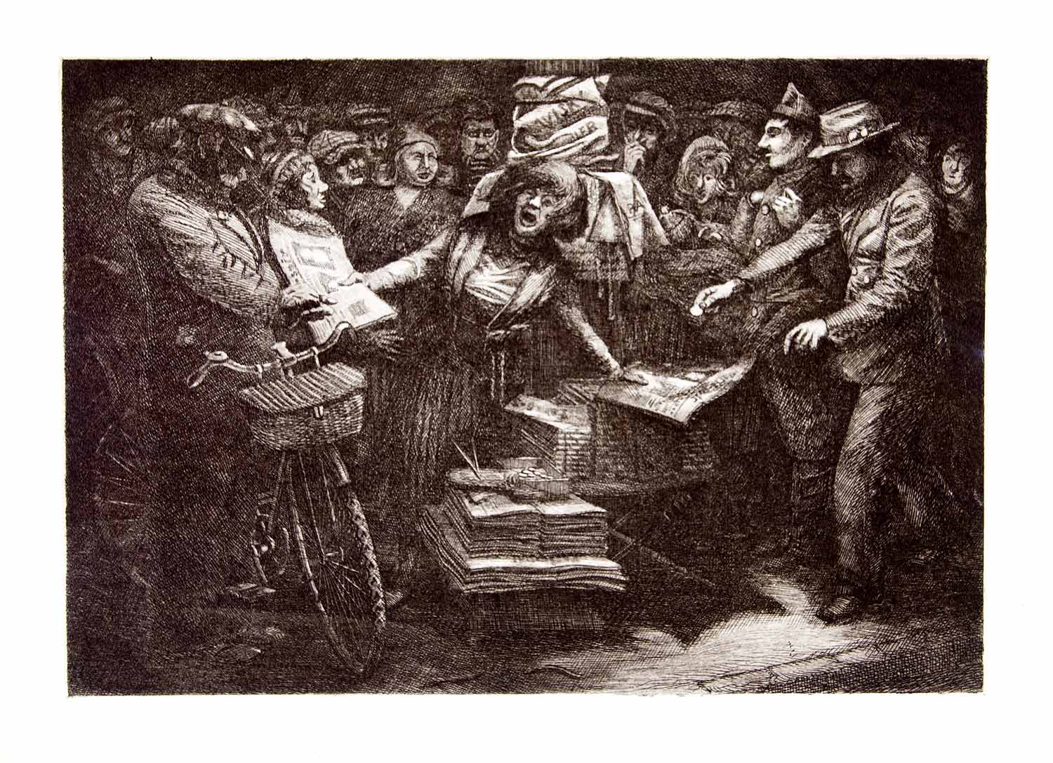 This is an original 1941 black and white photogravure of a woman selling newspapers in Paris, France.