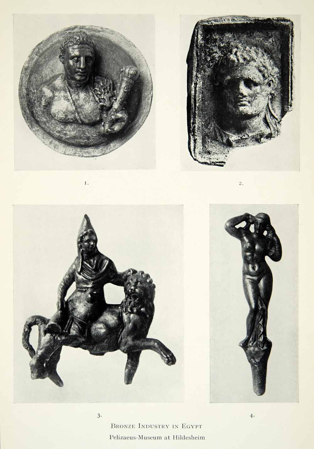 1. Bust of Heracles with club and lion skin. 2. Plaster model of bronze plaquette displaying the head of Ptolemy Soter. 3. Statuette of Attis on a lion's back. 4. Head of a hairpin with Aphrodite dressing her hair.