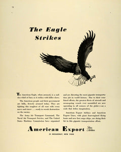 This is an original 1942 World War II black and white print ad for American Export Airlines and American Export LInes, who are doing their part to aid in the war production efforts by manufacturing flying boats, aircrafts, cargo ships and more for use by the U. S. military.