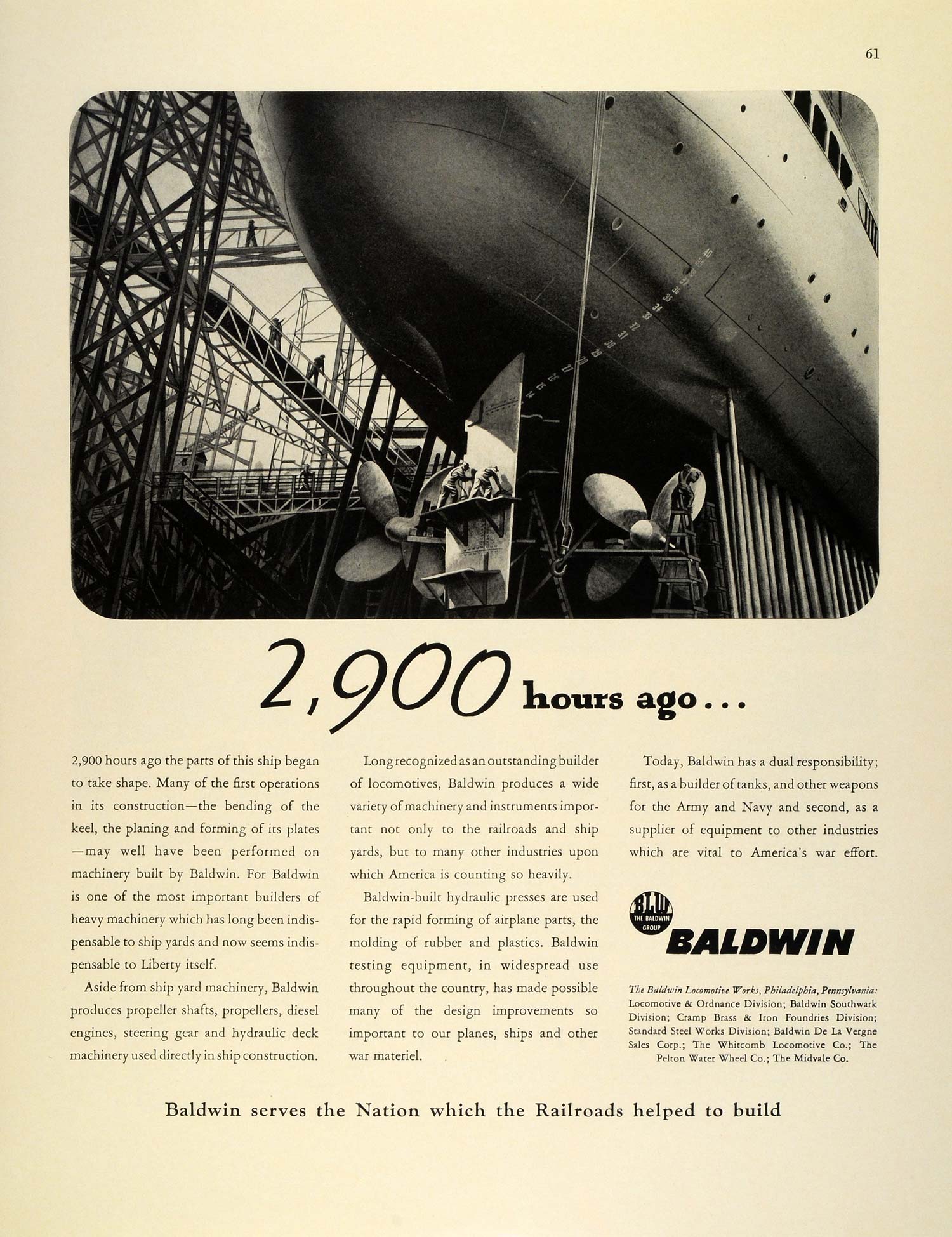 This is an original 1942 World War II black and white print ad for The Baldwin Locomotive Works of Philadelphia, Pennsylvania, who are doing their part in the war production efforts by aiding in shipbuilding, providing aviation parts, constructing military tanks and building railroads and trains to aid in commercial and military traffic.