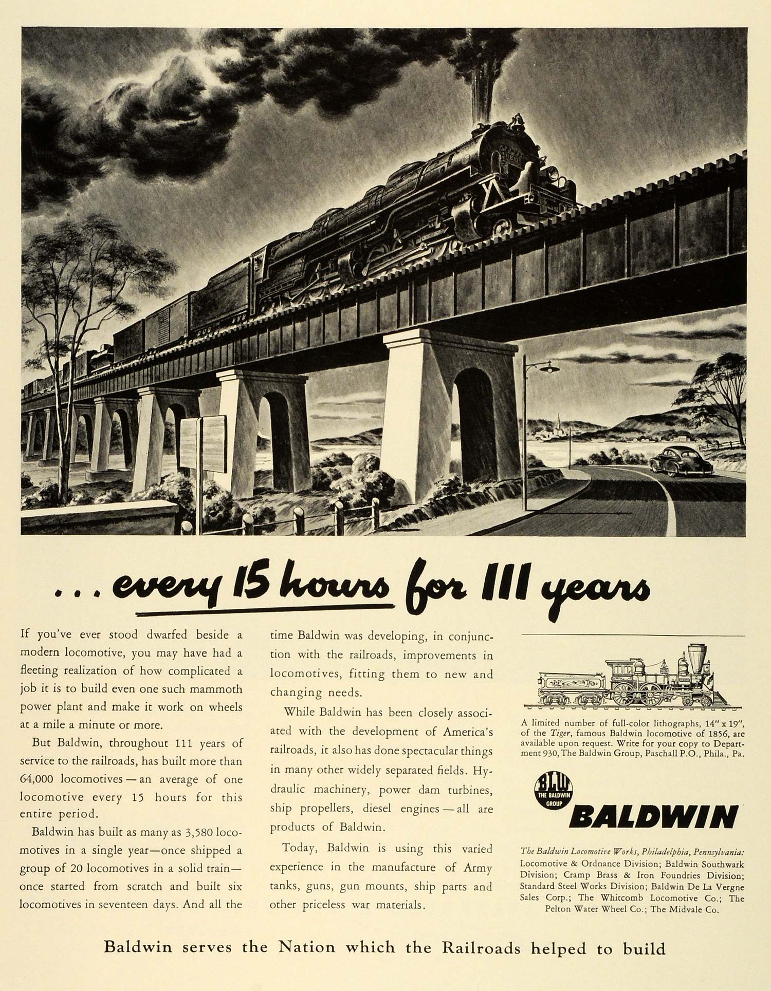 This is an original 1942 black and white print ad for the Baldwin Locomotive Works located in Philadelphia, Pennsylvania.