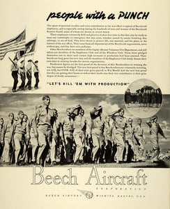 This is an original 1942 World War II black and white print ad for the Beech Aircraft Corporation of Wichita, Kansas, who are doing their part to aid in the war production efforts by enlisting men of the Volunteer Fire Department, the Employees Club and the Whiskers Club to help construct quality aircrafts for use by the U. S. military.