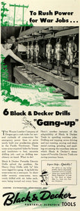 This is an original 1942 World War II two-color print ad for Black and Decker Portable Electric Tools and Drills.