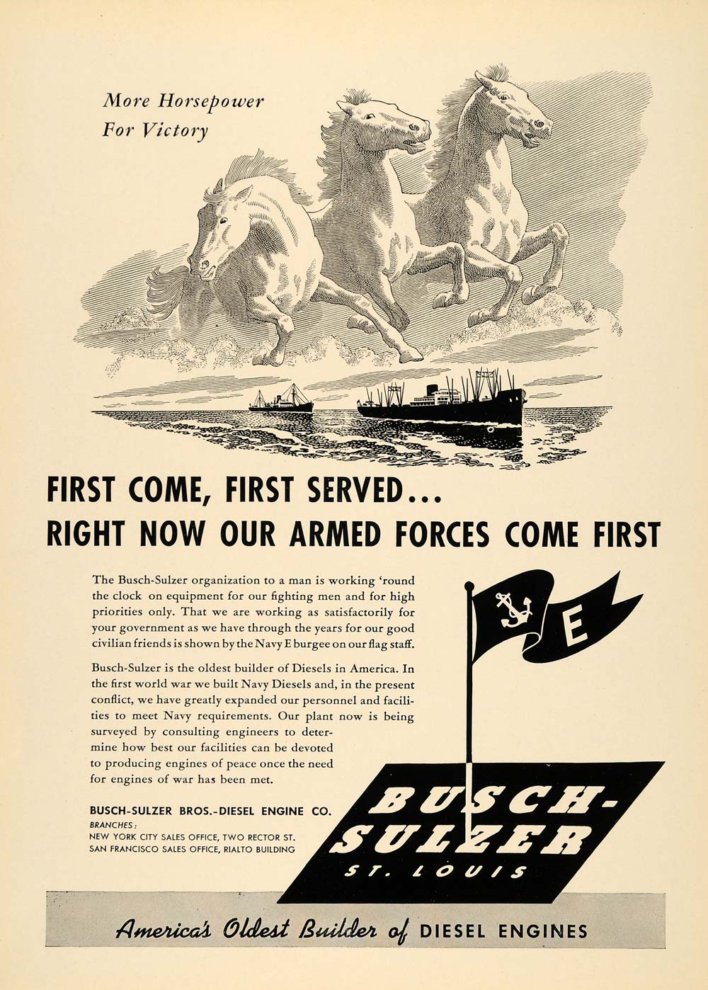This is an original 1942 black and white print ad for the Busch-Sulzer Bros. - Diesel Engine Company located in New York.