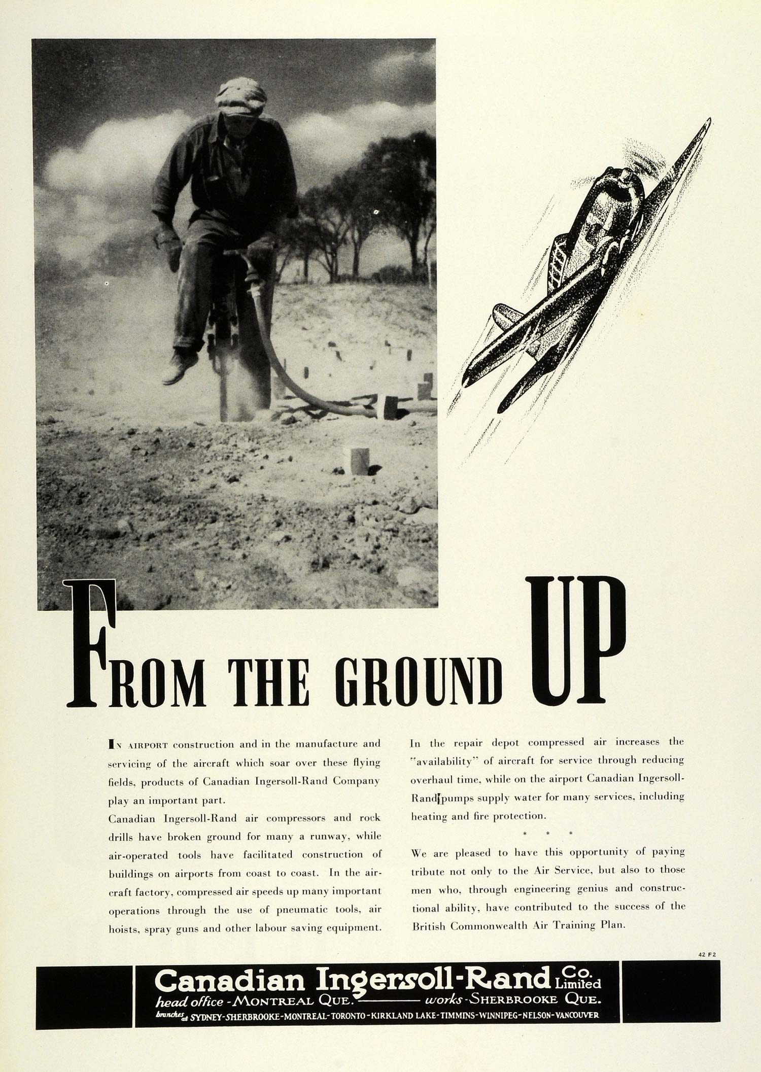 This is an original 1942 black and white print ad for the Canadian Ingersoll-Rand Air Compressors and Rock Drills from Canadian Ingersoll-Rand Company Limited located in Montreal, Quebec, Canada.