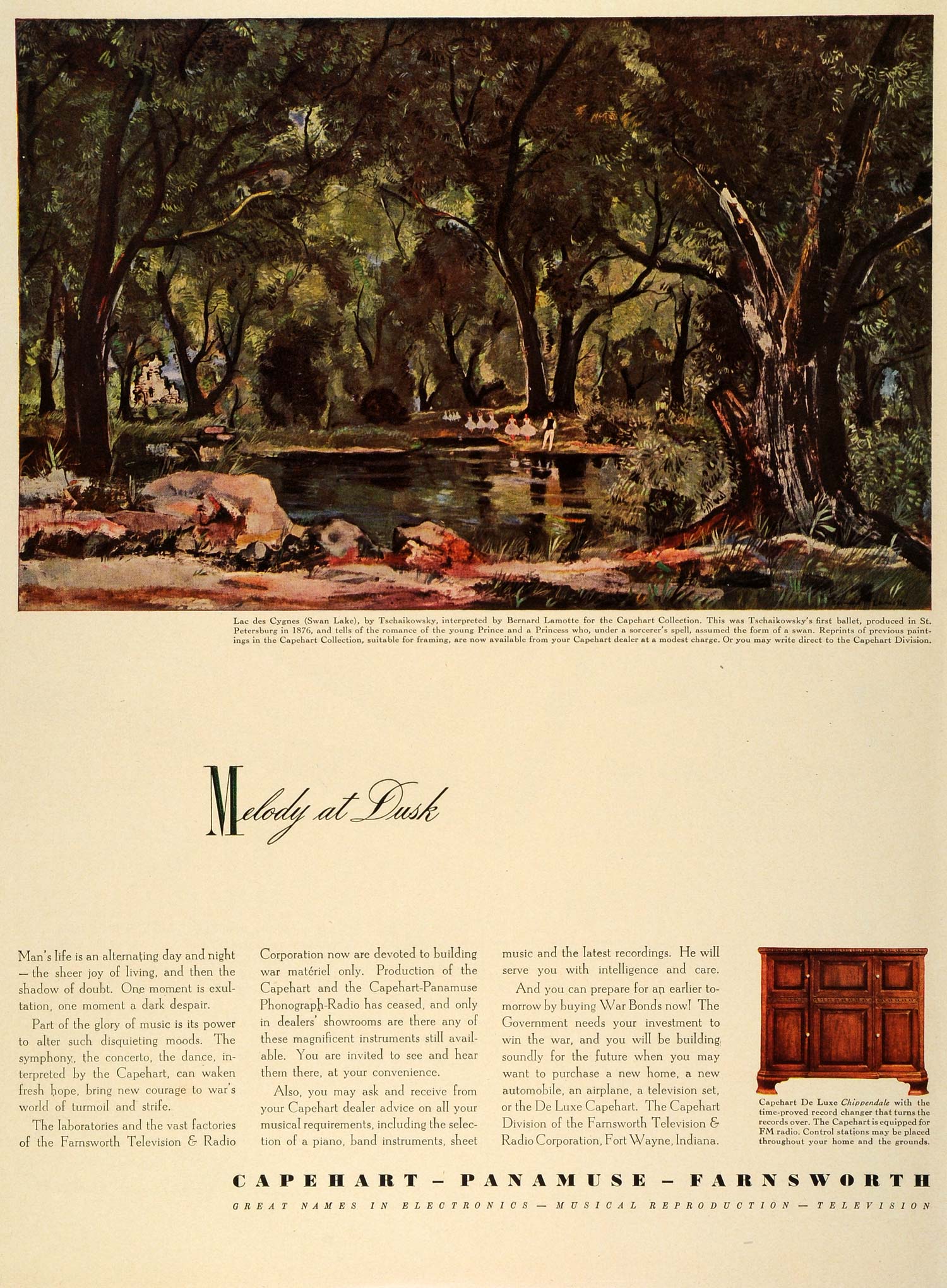 This is an original 1942 color print ad for Capehart, Panamuse and Farnsworth electronics, musical reproductions and televisions. The illustration in this ad is of Lac des Cygnes (Swan Lake), by Tschaikowsky, interpreted by Bernard Lamotte.
