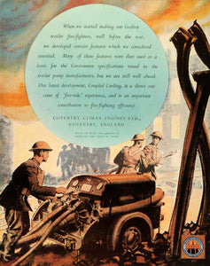 This is an original 1942 color print ad for Coventry Climax Engines Ltd. of Coventry, England; this ad features their Godiva firefighting trailers and machinery during the World War II era.