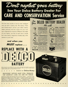 This is an original 1942 black and white print ad for Delco-Remy of Anderson, Indiana, featuring their Delco batteries for automobiles and other household uses.
