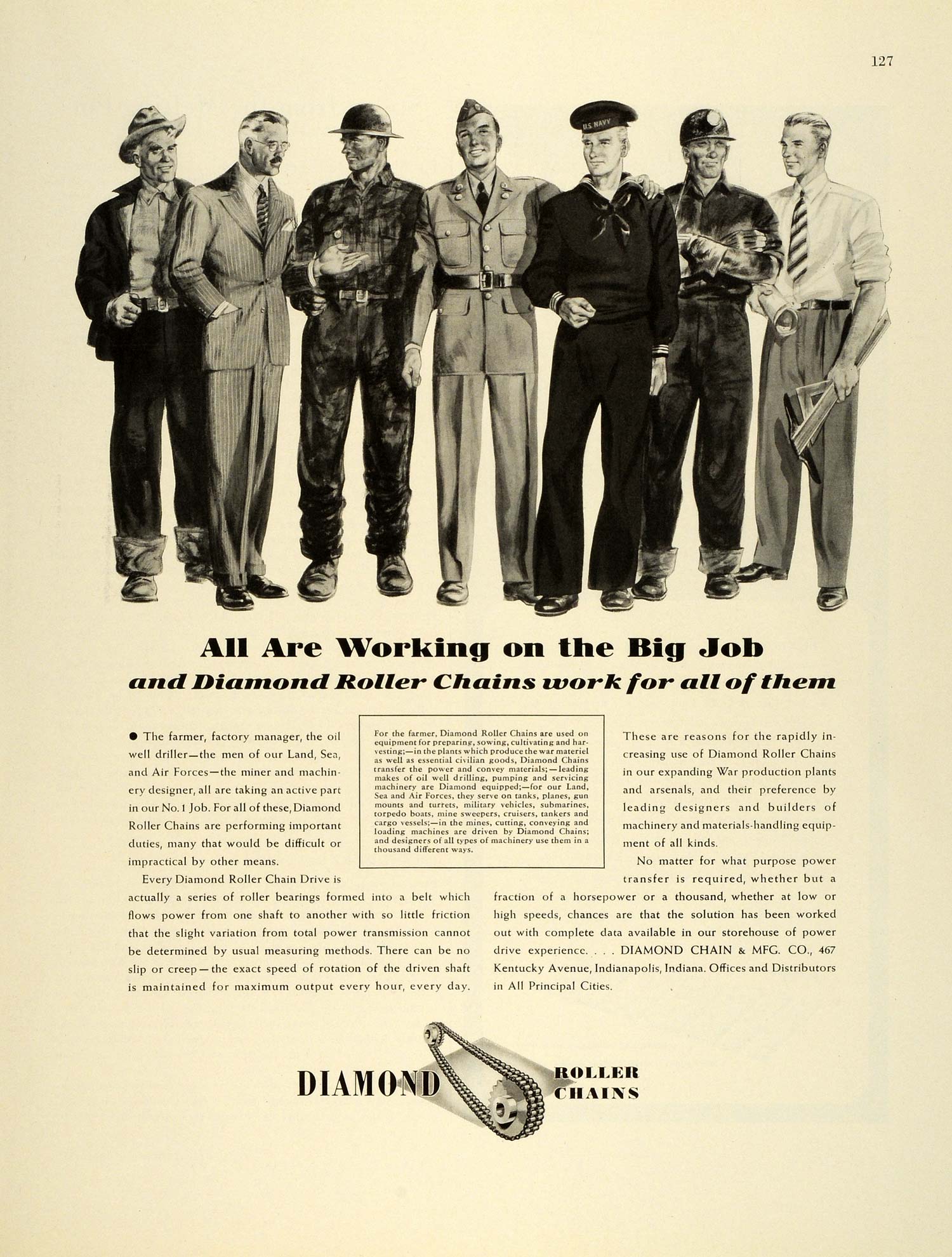 This is an original 1942 black and white print ad for the Diamond Roller Chains from Diamond Chain and Manufacturing Company located at 467 Kentucky Avenue, Indianapolis, Indiana.