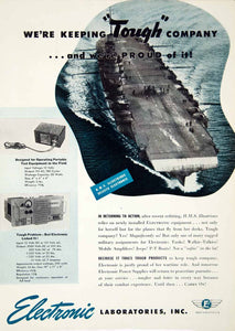 This is an original 1942 two-color print ad for Electronic Laboratories Inc., which made various electronic products such as amplifiers and walkie-talkies.