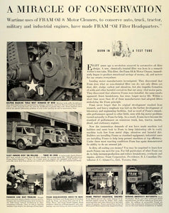 This is an original 1942 World War II black and white print ad for Fram Oil and Motor Cleaners for agriculture machinery, military machinery, automobiles and trucks.