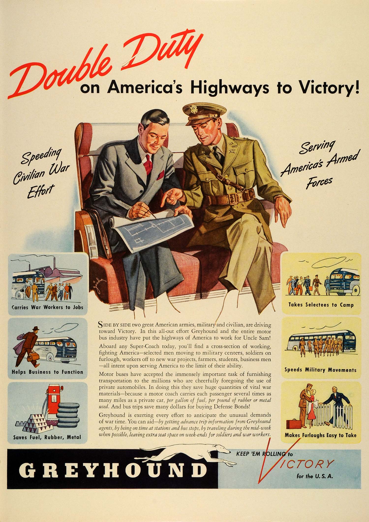 Keywords specific to this image: Vintage Advertising, Alternative Transportation, Wartime, War Aid, Defense Bonds, Military, Greyhound Super Coach Bus