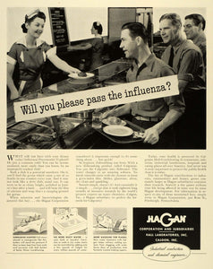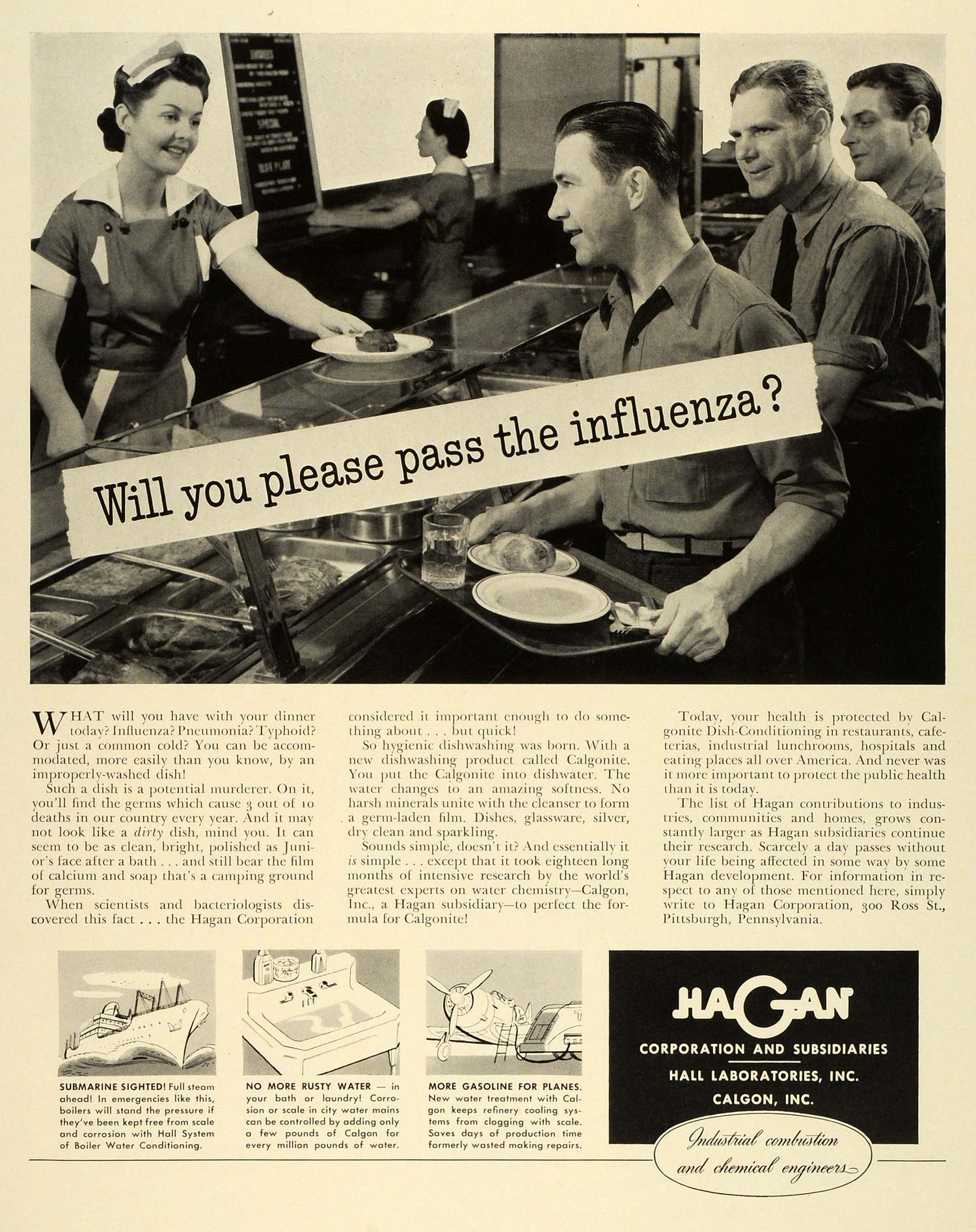This is an original 1942 World War II black and white print ad for Calgonite dishwashing fluid, a product by the Hagan Corporation, located at 300 Ross Street in Pittsburgh, Pennsylvania. This company is encouraging the use of their product to prevent the spread of illness among war production workers during a time when every able body is needed.