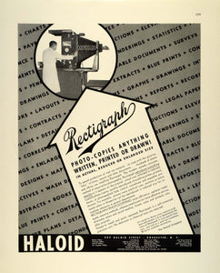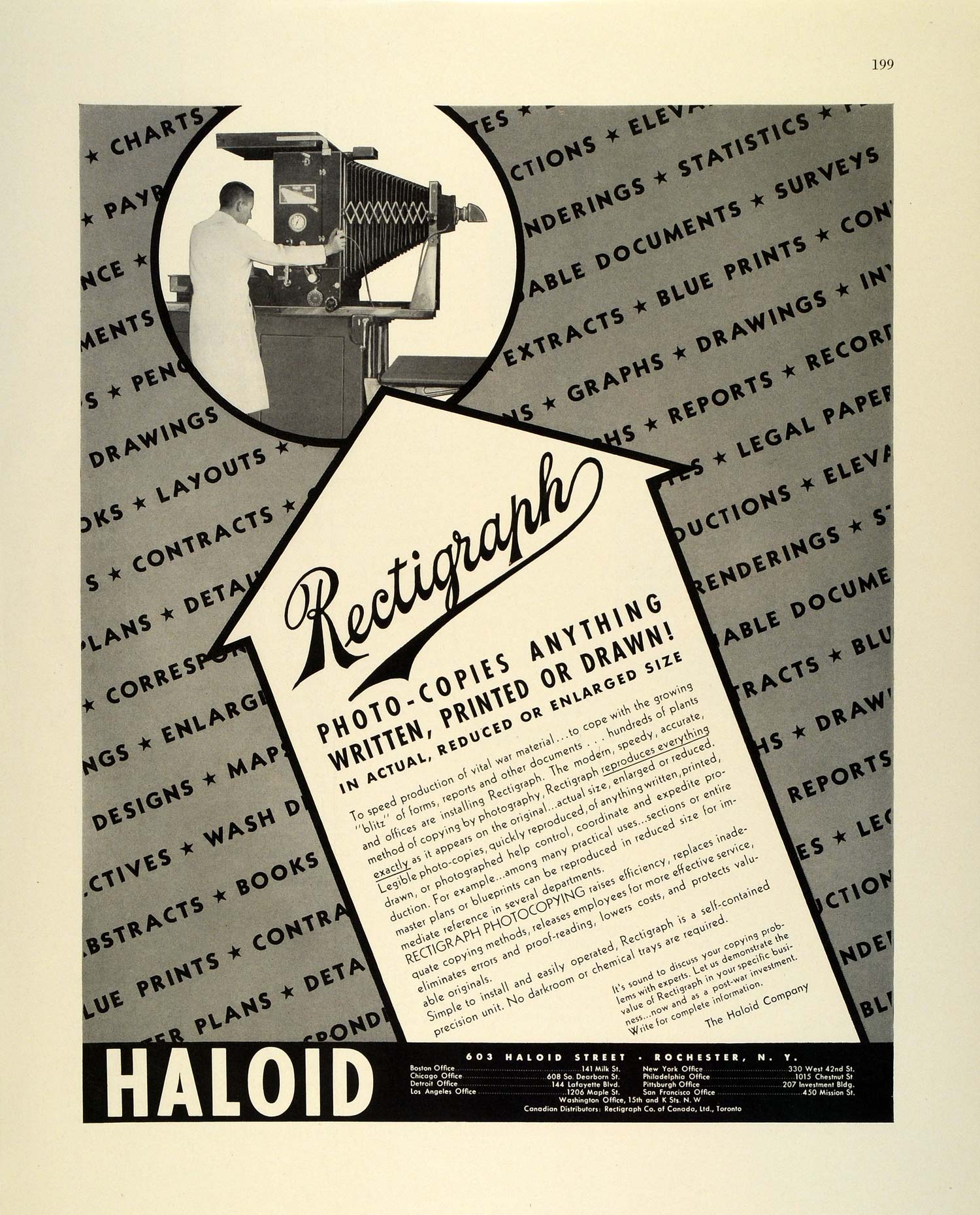 This is an original 1942 World War II Era black and white print ad for the Rectigraph Photocopying Machine, a product by The Haloid Company, located at 603 Haloid Street in Rochester, New York.